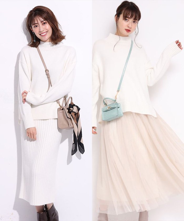 ドロップショルダーで仕上げたゆったりシルエットのハイネックニットプルオーバーと