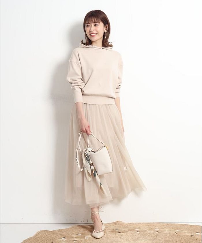 フーディ×タイトスカートのニットアップに、ふんわりチュールのスカートがセットに!