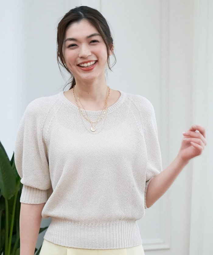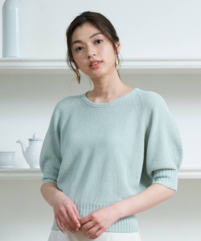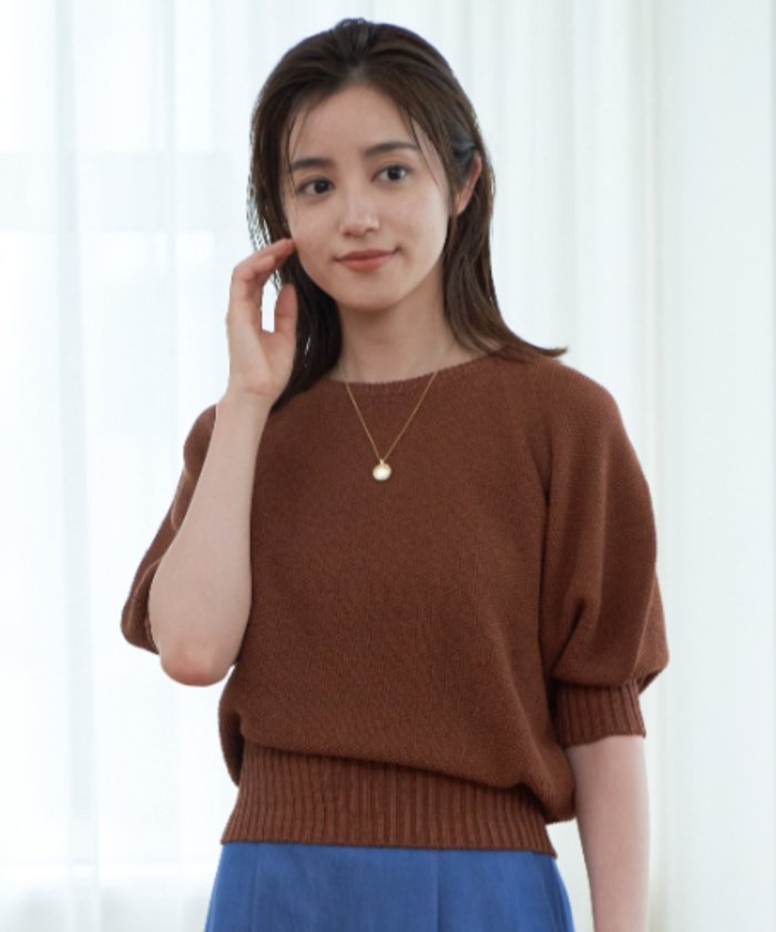 程良くハリのある鹿の子編みで編み上げたプルオーバーは 接ぎ目の無いホールガーメント製で、立体的な綺麗なパフスリーブを表現しました。