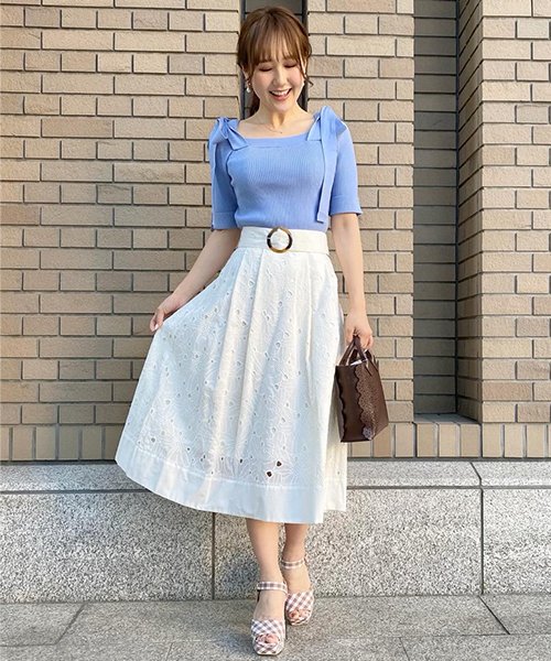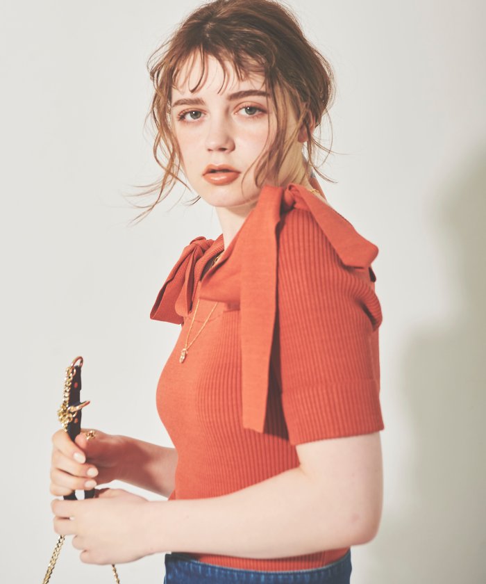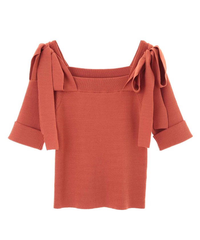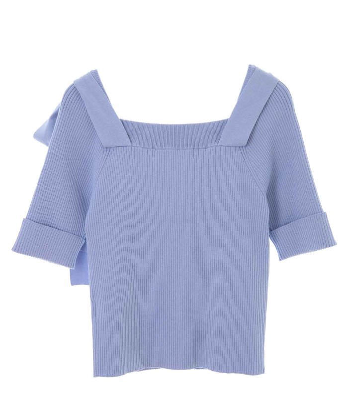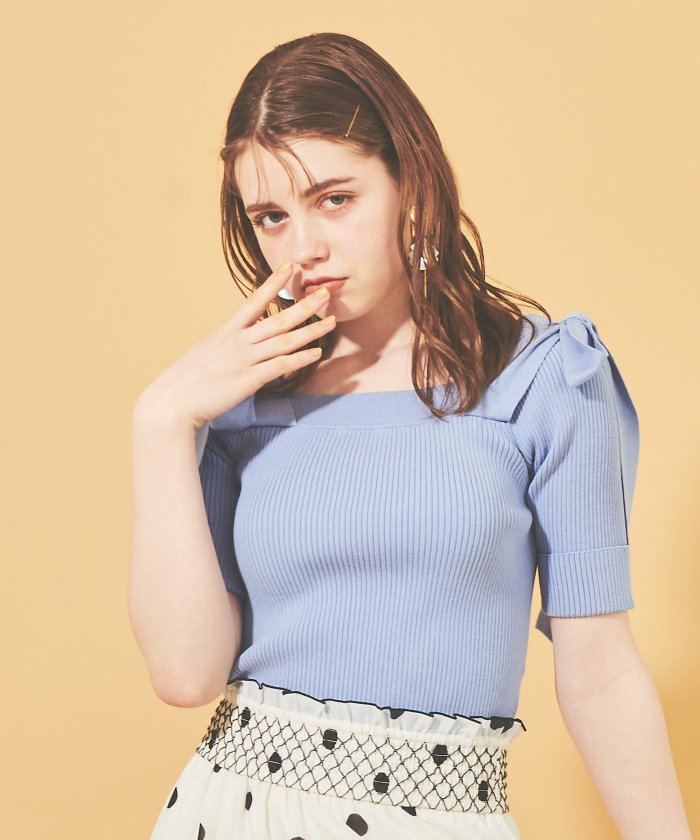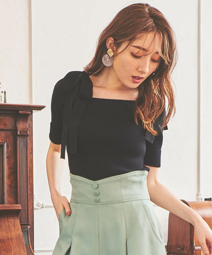 肩をリボンで結ぶスクエアネックのリブニット。袖口折り返しデザイン。シンプルで合わせやすいけれど長く垂れたリボンがとても華やかなアイテム。
