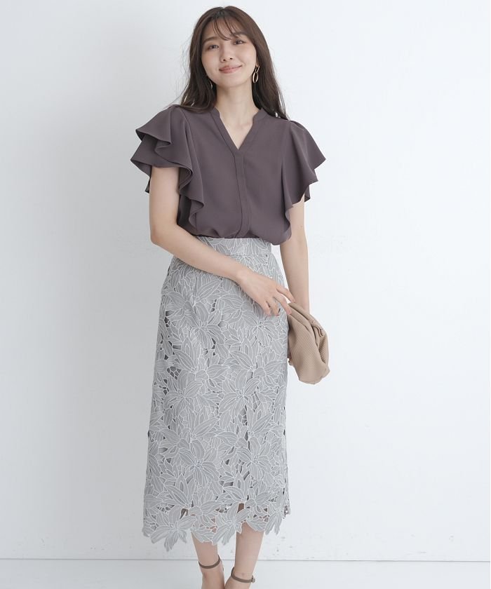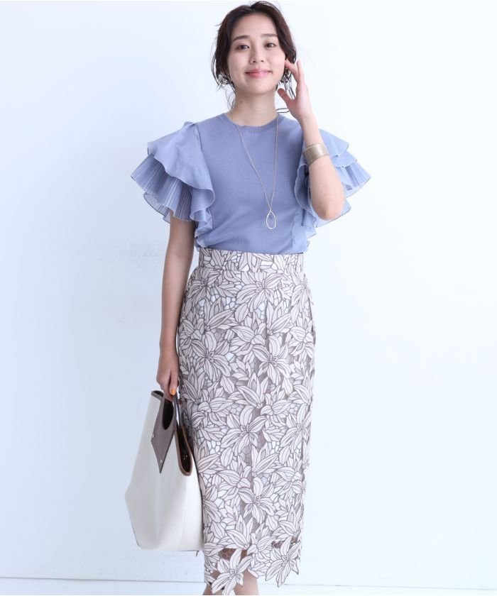 大振りのフラワーレースが装いを華やかに彩るタイトスカート。