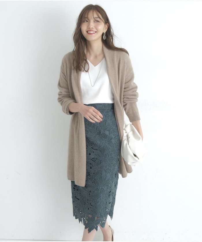 Iラインですっきり見えするシルエットが、スタイリングを品良くまとめてくれる秘訣。レースのディテールが引き立つ裾デザインもポイントです。
