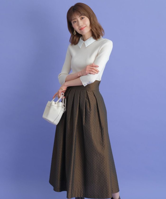 ハイウエストで脚長効果もアシスト。タックの生み出す立体的なフレアラインが、エレガントなムードを演出します。