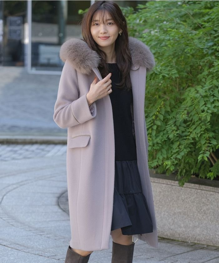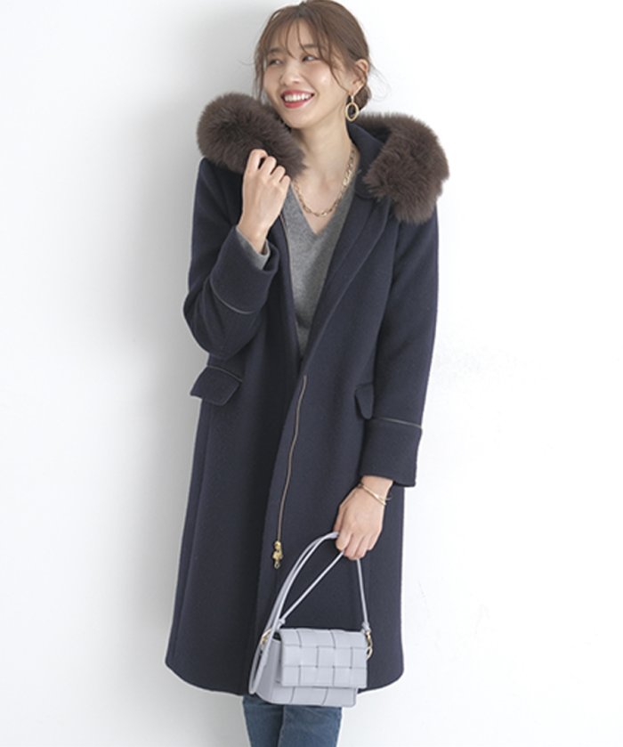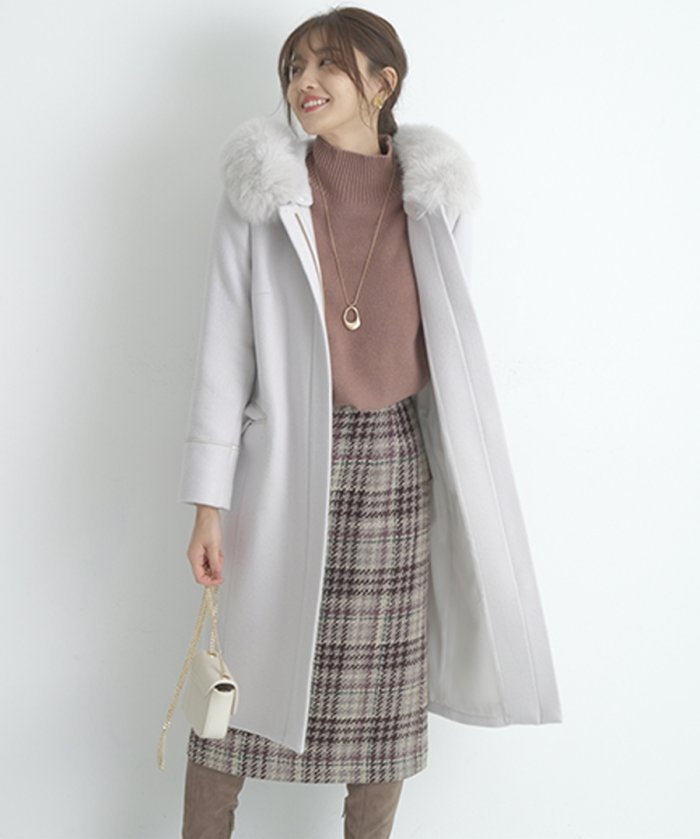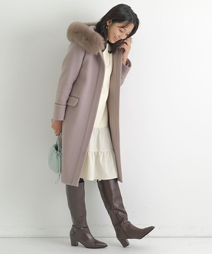 フードの縁にあしらったふわふわ素材がほっこりとリッチにアピールするコート。