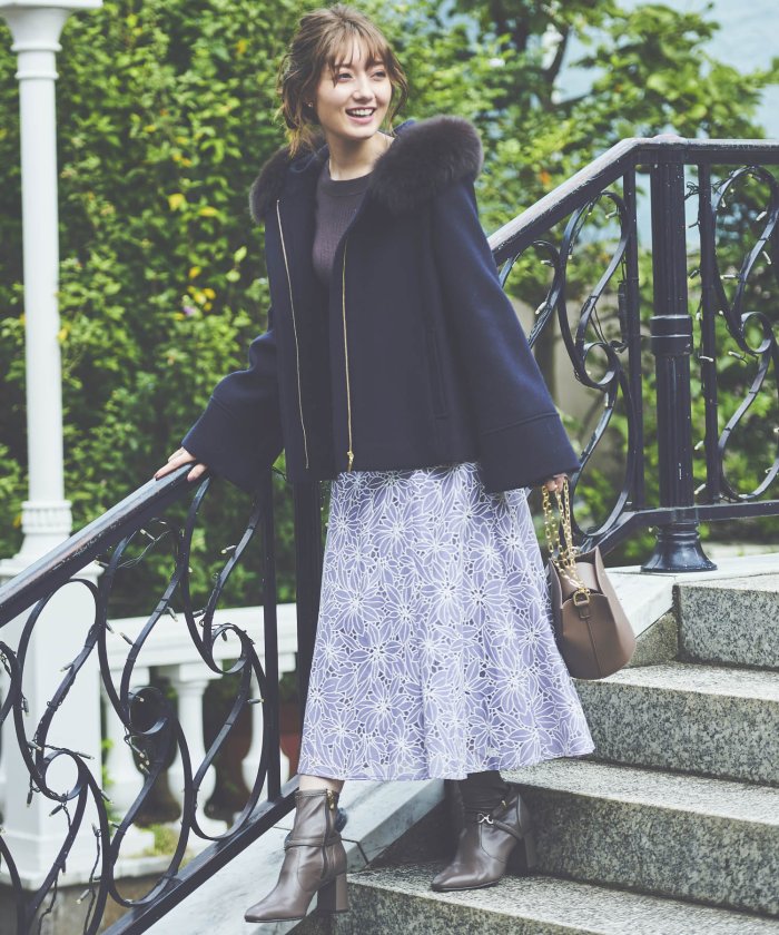 トレンドのロングスカートのコーディネートでもバランスよく着こなせるアウターは着回し力◎です。