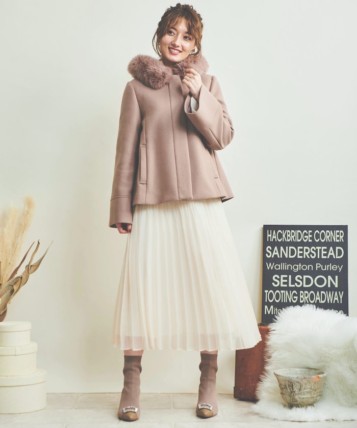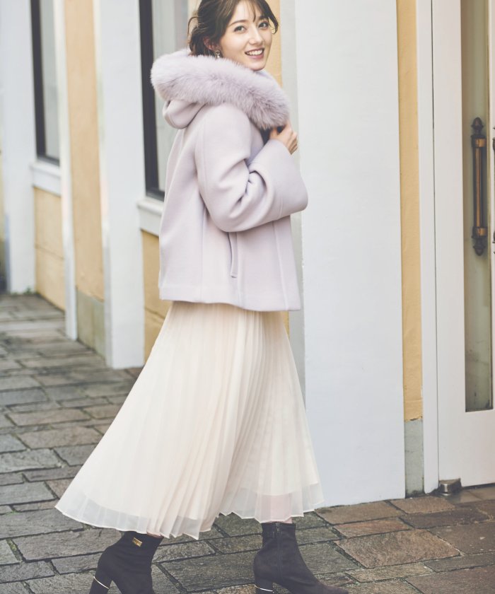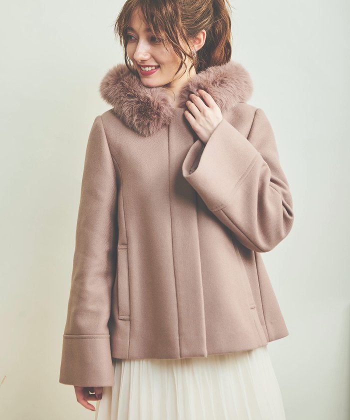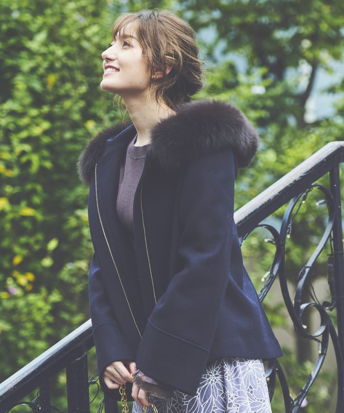 取り外し可能なボリューミーなフードファーがポイントのショートコート。