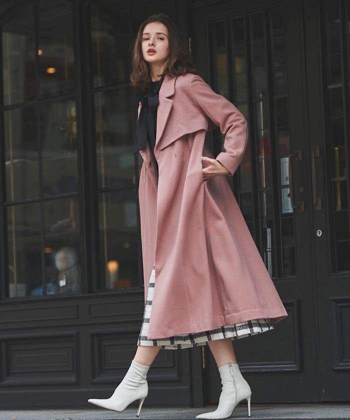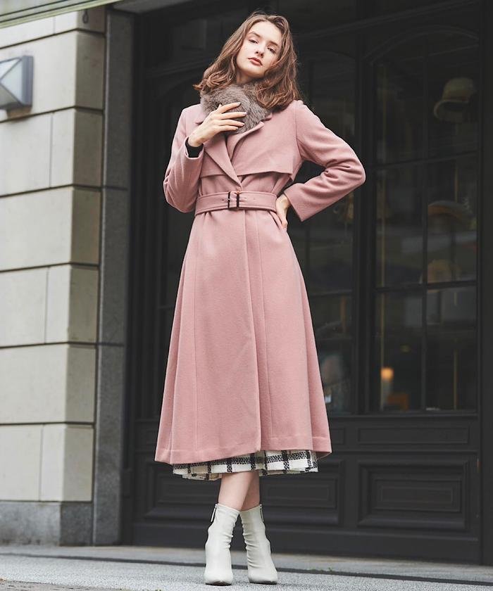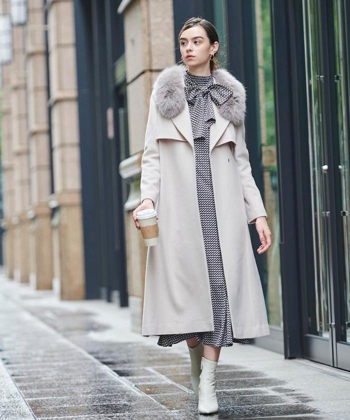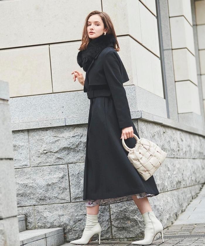 バックル付きの共布ベルトでウエストマークで着用しクラシカルなムードに、ベルトをなしで前を開けて着用しすっきりとした大人見えに、ファーティペットを有り、無しで華やかにもスタイリッシュにもと、様々な表情での着用を楽しめます。