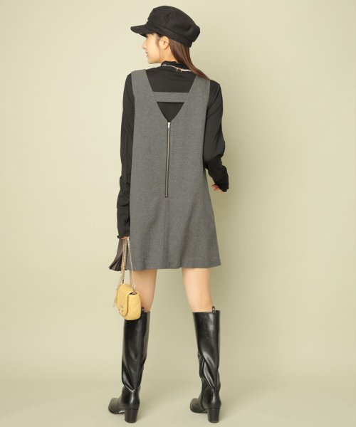 ジャンパースカートは深めのVが顔周りをシャープに演出。