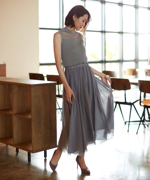 スカートは、ウエスト部分に細かいプリーツ加工を施しており、お腹まわりはすっきりと、裾はボリューム感のある、エレガントな女性らしいシルエットを体現。